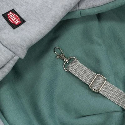 Bolso para transportar a cachorros y perros pequeños de hasta 5 kg cerca del cuerpo. Ofrece sensación de seguridad. Material elástico y con correa corta. Color: gris claro/menta