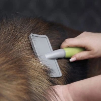 La carda grande de Moser es perfecta para eliminar los pelos sueltos, la suciedad y la pelusa del pelaje de tu perro. Tiene un mango ergonómico y un atractivo diseño en verde, gris y negro.
