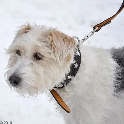Con el collar de cuero Stars su perro siempre estará a la moda. El cuero es muy suave, de color negro y remachado con estrellas en la parte exterior. En la parte interior está forrado en cuero color beige.